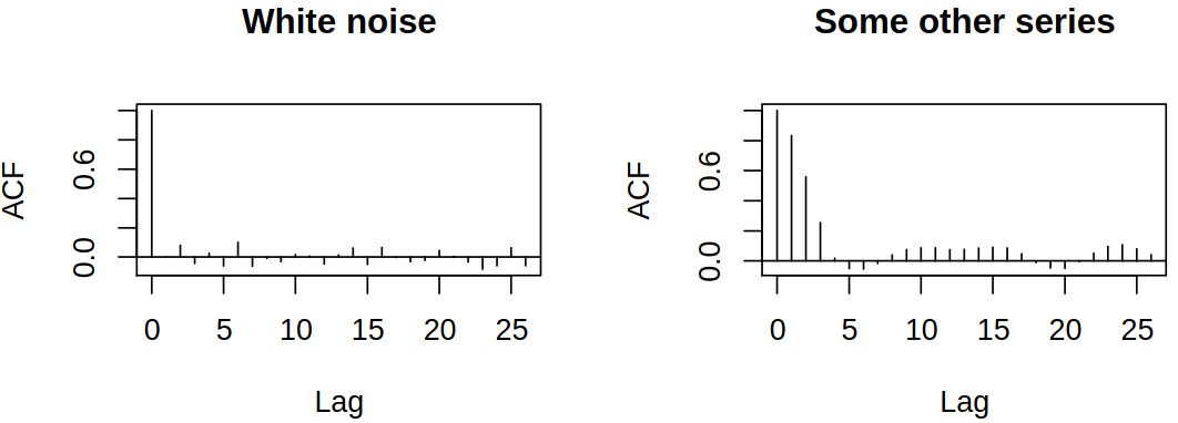 Recall the moving average \(\MAmod{q}\) \[ X_t = \ve_t + \tht_1 \ve_{t-1} + \dots + \tht_q \ve_{t-q} \] defined in Definition 7.3. We can extend it to \(\MAmod{\infty}\) as follows \[ \rX_t = \rve_t + \psi_1 \rve_{t-1} + \dots = \sum_{j = 0}^\infty \psi_j \rve_{t-j}. \] Remember now the already presented \(\ARmod{1}\) has the form \[ \rX_t = \vf_1 \rX_{t-1} + \rve_t = \vf_1^2 \rX_{t-2} + \vf_1 \rve_{t-1} + \rve_t = \dots = \vf_1^k \rX_{t-k} + \sum_{j = 0}^{k-1} \vf_1^j \rve_{t-j}, \] then maybe \[ \rX_t = \sum_{j = 0}^\infty \vf_1^j \rve_{t-j}. \] Much care is needed though – the series above should be the limit of random variables \(\sum_{j = 0}^n \psi_j \rve_{t-j}\) as \(n \to \infty\), but we haven’t specified in which sense we view this limit and it is not trivial to determine whether it exists.