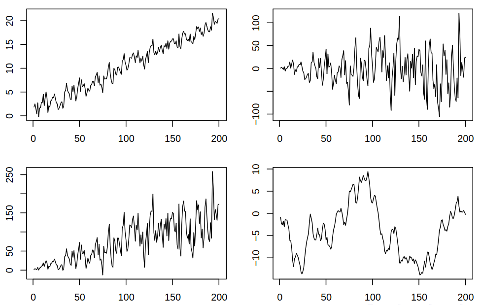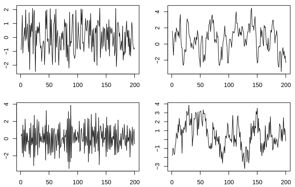 Definition 3.2 (Weak stationarity) A process \(\set{\rnd X_t : t \in \Z}\) is said to be weakly (weak-sense, second-order) stationary if the \(\mu_t\) is constant in time and \(\acov(s,t)\) depends only on the difference \(s-t\).