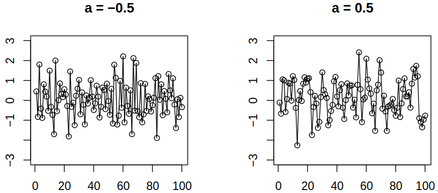 We can compute \(\acov(0) = \sigma^2\), \(\acov(1) = a\sigma^2/(1+a^2)\) and \(\acov(h) = 0\) for \(\absval{h} > 1\), thus \(\acf(1) = a / (1 + a^2)\) and \(\acf(h) = 0\) for \(\absval{h} > 1\). Therefore this process has the same variance for all \(a\) but the correlation depends on \(a\).