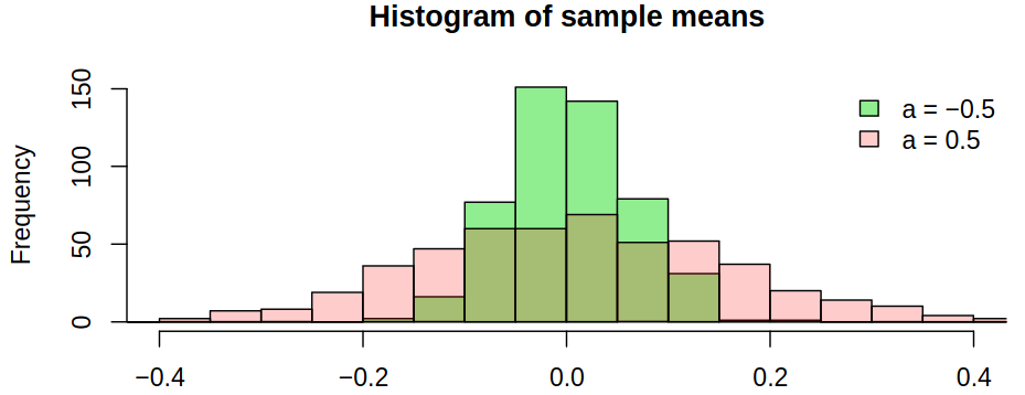 We can make the observation, that negative correlation improves the estimation of \(\mu\) – there will be more oscillations back and forth across the mean. On the other hand, a positive correlation reduces the accuracy of the estimate. Just as an illustration, we can simulate \(500\) realizations of length \(n = 100\) with \(\mu = 0\) and compute \(\estim{\rnd \mu}\) for each of them