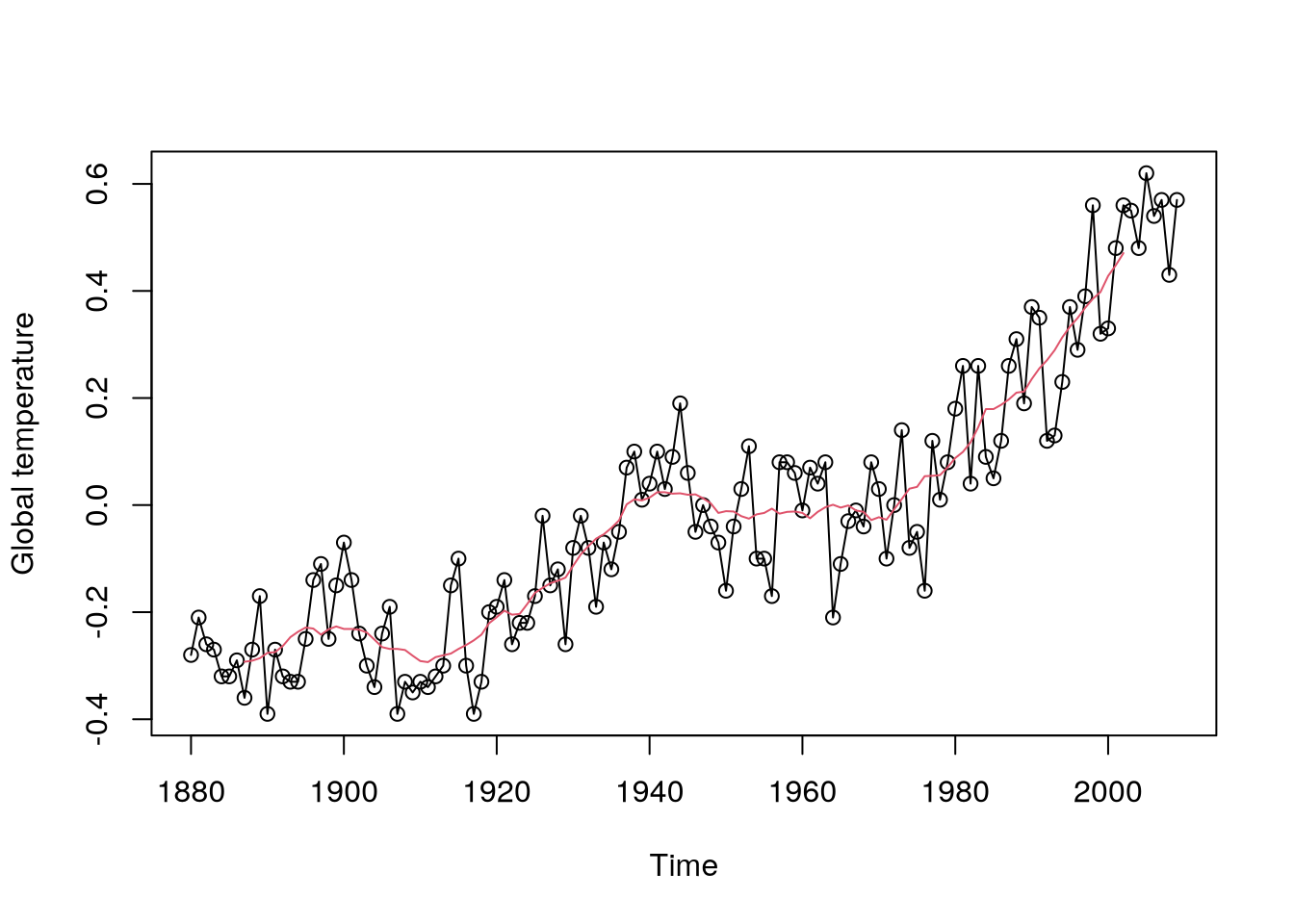 Example 5.1 (Annual global temperature series) With the following code, we can plot Figure 5.1, where a possible monotonic trend (linear, maybe quadratic) can be seen.
