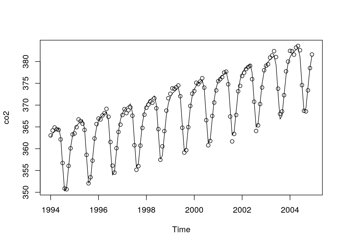 lines(as.vector(time(co2)),fitted(co2.m1))Or we can consider other equivalent models.