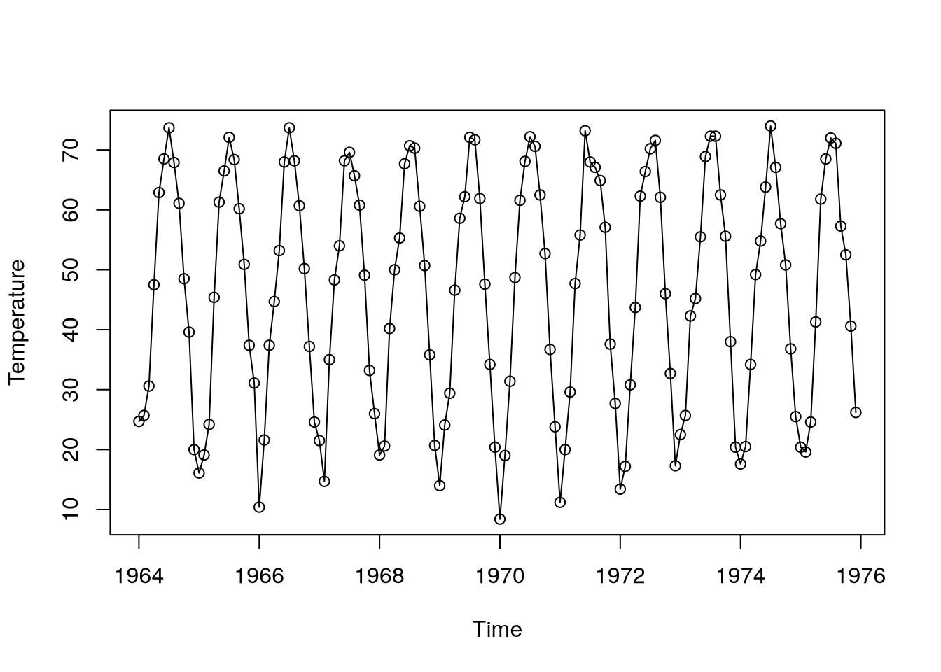 )We can now look at the fitted values in the harmonic model for monthly temperatures.
