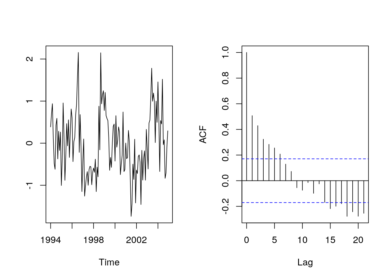 How do we know that the correlation model was correctly specified? The residuals should look like white noise (in particular, no correlation). The function gls in the R package nlme can do this estimation but it is primarily designed for something else (grouped data), we will see tools that are more appropriate for time series