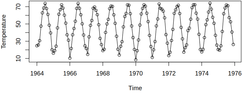 Here, waves look like cosines (unlike in the \(\text{CO}_2\) series), so our idea might be to model the deterministic component with a cosine wave with known frequency (e.g., \(f = \frac 1 {12}\)) and unknown amplitude and phase \[ \mu_t = \beta_0 + \beta_1 t + a \cos \brackets{2\pi f t + \vf}. \]