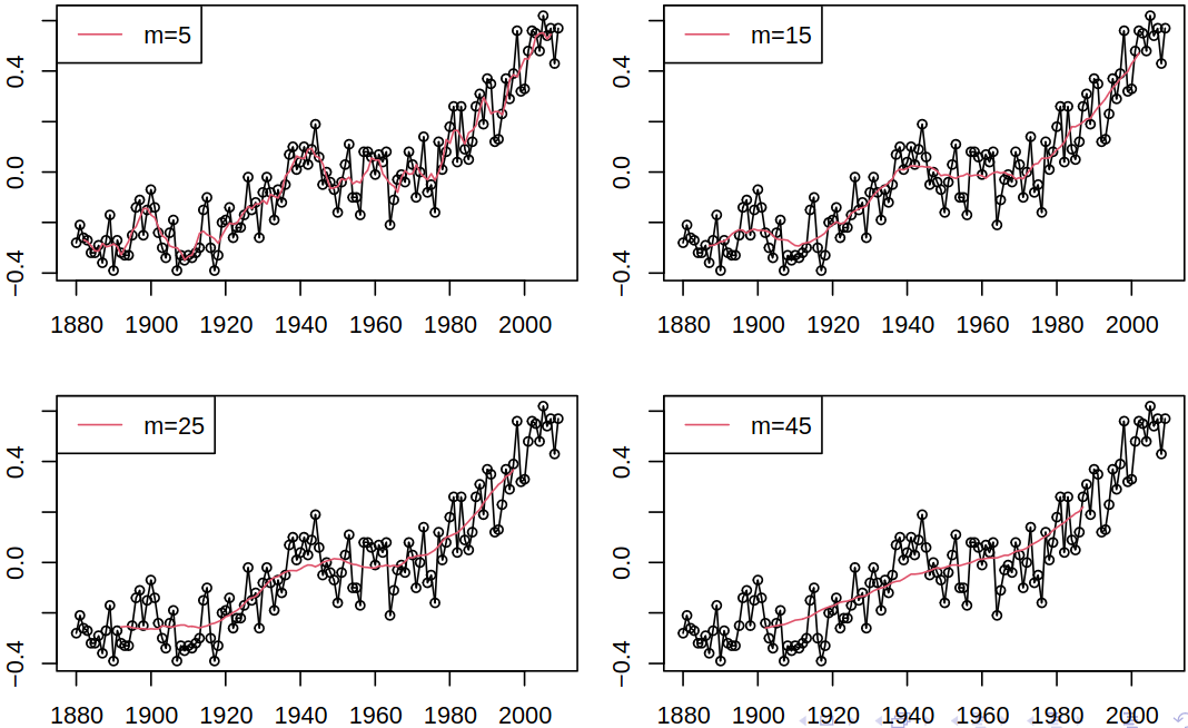 Definition 5.2 (Moving average Smoother) Moving average smoother of order \(m = 2k+1\) is a transformed series \[ \estim{\rnd T}_t = \frac 1 m \sum_{j = -k}^k \rnd X_{t+j}, \] or for \(m = 2k\) even, we can use \[ \estim{\rnd T}_t = \frac 1 {2m} \rnd X_{t-k} + \frac 1 m \rnd X_{t-k+1} + \dots + \frac 1 m \rnd X_{t+k-1} + \frac 1 {2m} X_{t+k}. \]
