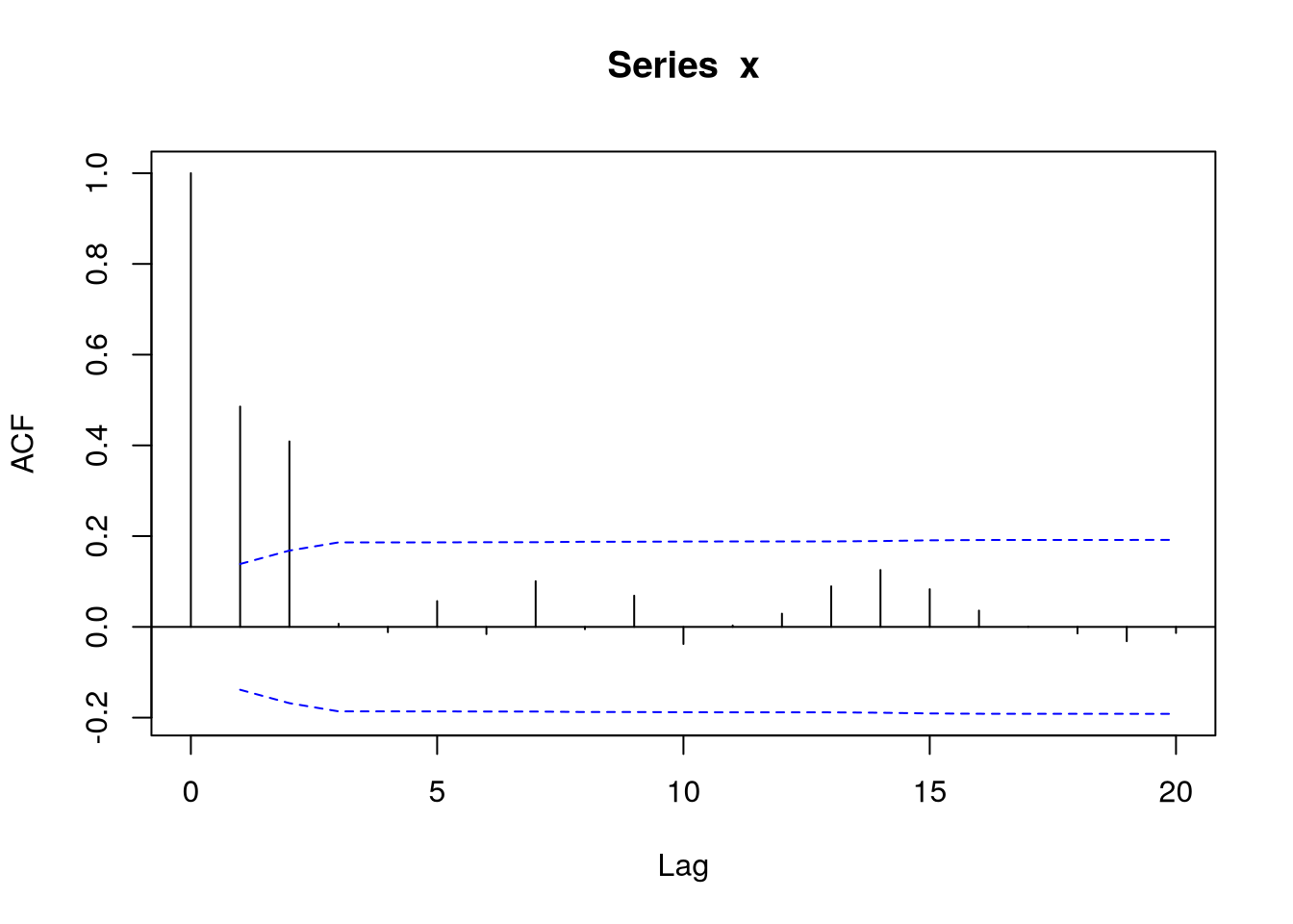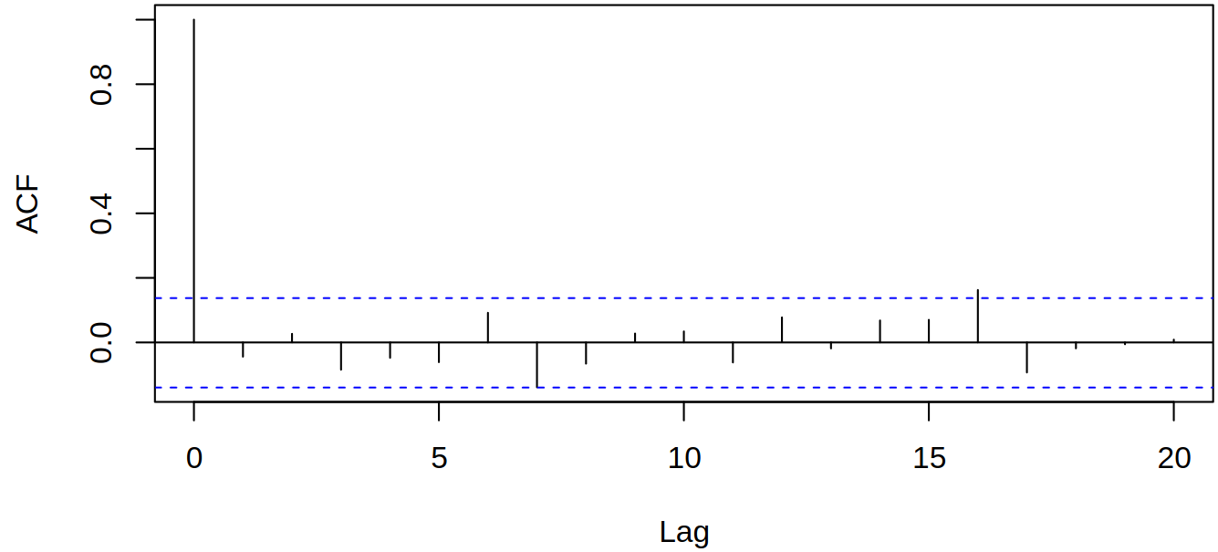 acf(x,ci.type="ma",lag.max=20)4 Estimation of the autocorrelation function