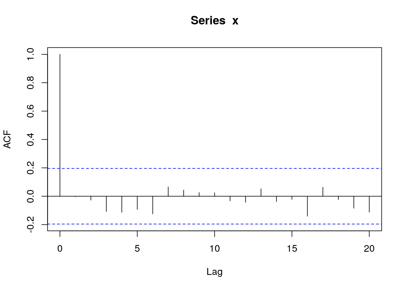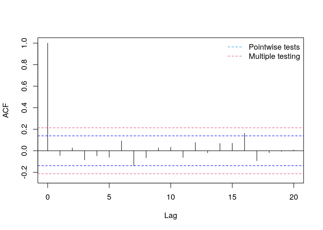 Here in Figure 4.2, the limits are at \(\pm 1.96/\sqrt n\). At lag \(j\), they indicate the rejection regions for testing the null hypothesis of no autocorrelation against the alternative that \(\acf(j) \neq 0\). When the estimated acf is between the blue dotted lines, i.e. in the confined region, we do not reject the null hypothesis. Due to the approximate independence, one can expect \(\alpha \times 100\%\) false rejections on average (e.g., 1 out of 20).