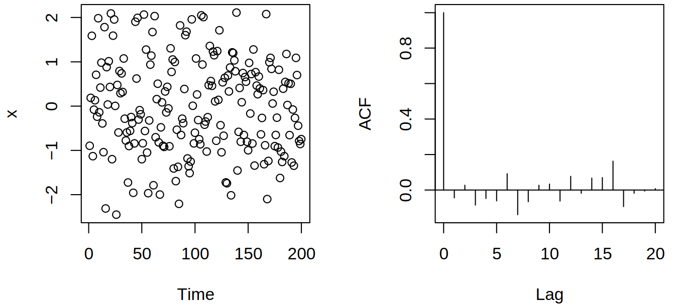 Therefore we are in a situation where we have observations \(\rnd X_1, \dots, \rnd X_n\) of a stationary series and let our goal be to estimate \[ \acov(h) = \cov(\rnd X_t, \rnd X_{t+h}) = \Expect{(\rnd X_t - \mu)(\rnd X_{t+h} - \mu)}. \] Naturally, we can use the empirical counterpart \[ \estim{\rnd \acov}(h) = \frac {\sum_{i = 1}^{n-h} (\rnd X_i - \Avg{\vr X})(\rnd X_{i+h} - \Avg{\vr X})} n, \] where alternatively the denominator can be \(n-h\) or something similar, but \(n\) is typically used in the context of time series (for positive semi-definiteness and simplification of acf \(\acf\)). Now we can estimate the autocorrelation function \(\acf(h) = \frac {\acov(h)} {\acov(0)}\) by \[ \estim{\rnd \acf}(h) = \frac {\estim{\rnd \acov}(h)} {\estim{\rnd \acov}(0)} = \frac {\sum_{i = 1}^{n-h} (\rnd X_i - \Avg{\vr X})(\rnd X_{i+h} - \Avg{\vr X})} {\sum_{i = 1}^n (\rnd X_i - \Avg{\vr X})^2}. \] We can picture this with simulated white noise and its correlogram (plot of the estimated autocorrelation function \(\acf\)), see Figure 4.1.