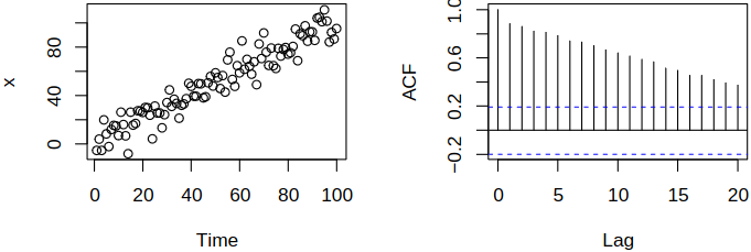 Surely, the \(\acf\) estimation and the correlogram make sense for stationary data. Now consider iid white noise \(\set{\rve_t}\) and define \(\rnd X_t = t + \rve_t\). Then \(\rnd X_t\) are independent variables, hence uncorrelated. If we directly apply the correlogram, we get misleading results, see Figure 4.3.