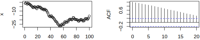 As this example shows, trends/deterministic components should be accounted for: e.g., model them by regression. Now consider the random walk \(\rnd X_t = \sum_{j = 1}^t \rve_j\) (this time series is non-stationary). Directly applying the correlogram to \(\rnd X_t\) indicates a complicated autocorrelation structure, see Figure 4.4.