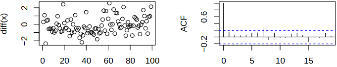 On the other hand, applying the correlogram to the differentiated series \(\set{\rnd X_t - \rnd X_{t-1}}\) suggests a much simpler structure, see Figure 4.5.